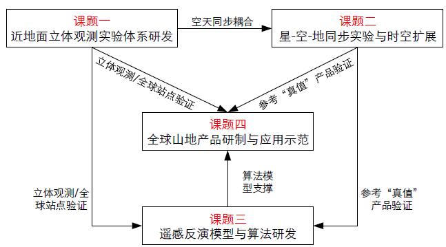 围绕开展山地生态系统综合立体观测并研制全球变化关键参数数据集产品这一目标,本项目分解为以下4 个课题: 课题一:山地生态系统全球变化关键参数近地面立体观测实验体系研发; 课题二:典型山地生态系统全球变化关键参数星-空-地立体观测与时空尺度扩展; 课题三:山地生态系统全球变化关键参数遥感反演模型与算法研发; 课题四:山地生态系统全球变化关键参数产品研制与应用示范。